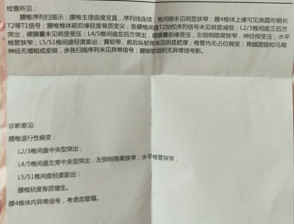 结果说是腰肌劳损给我开了一大堆止疼,非但没好,病情还有加重的趋势,后来又去,确诊为腰椎L2/3/4/5腰椎突出、L5/S1膨出、椎管狭窄、骨质增生。而且可能患有骨癌(这是我对腰椎病不重视带来的后果,还好最终确认不是骨癌),医生建议我做手术,当时病情拖的太严重了,没有办法只能听医生的手术,然而这时噩梦刚刚开始,让本来不富裕的家庭更加的负债累累,让我痛不欲生。
